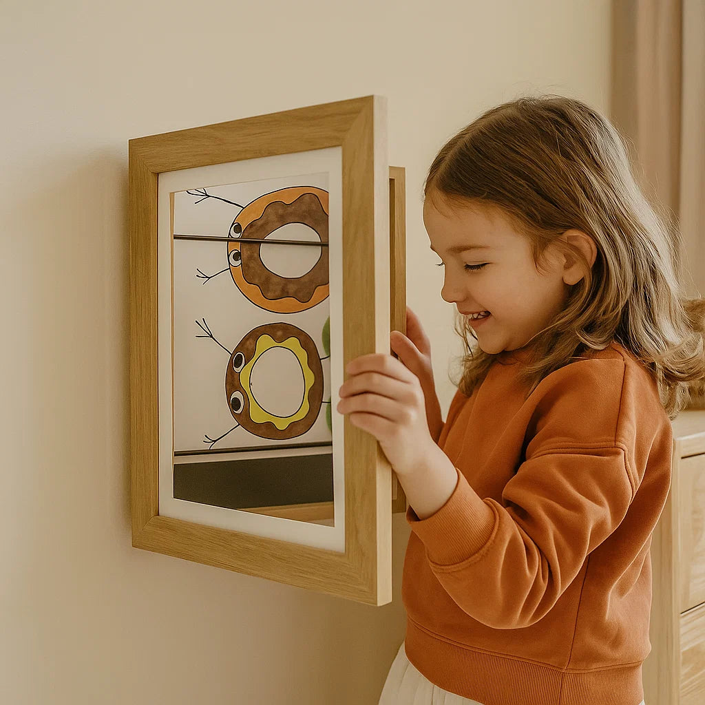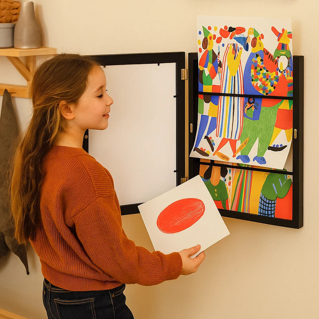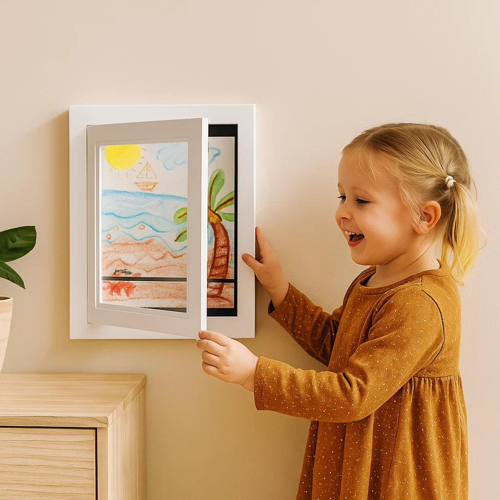 Barnas kunstutstillingsramme ⎜ Oppslåbar bilderamme med oppbevaringsplass for tegninger og kreative prosjekter