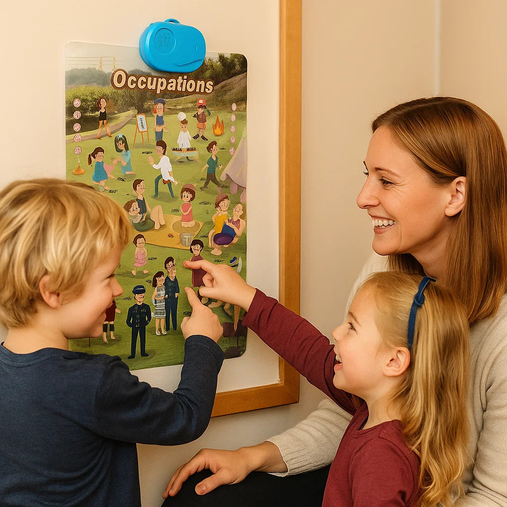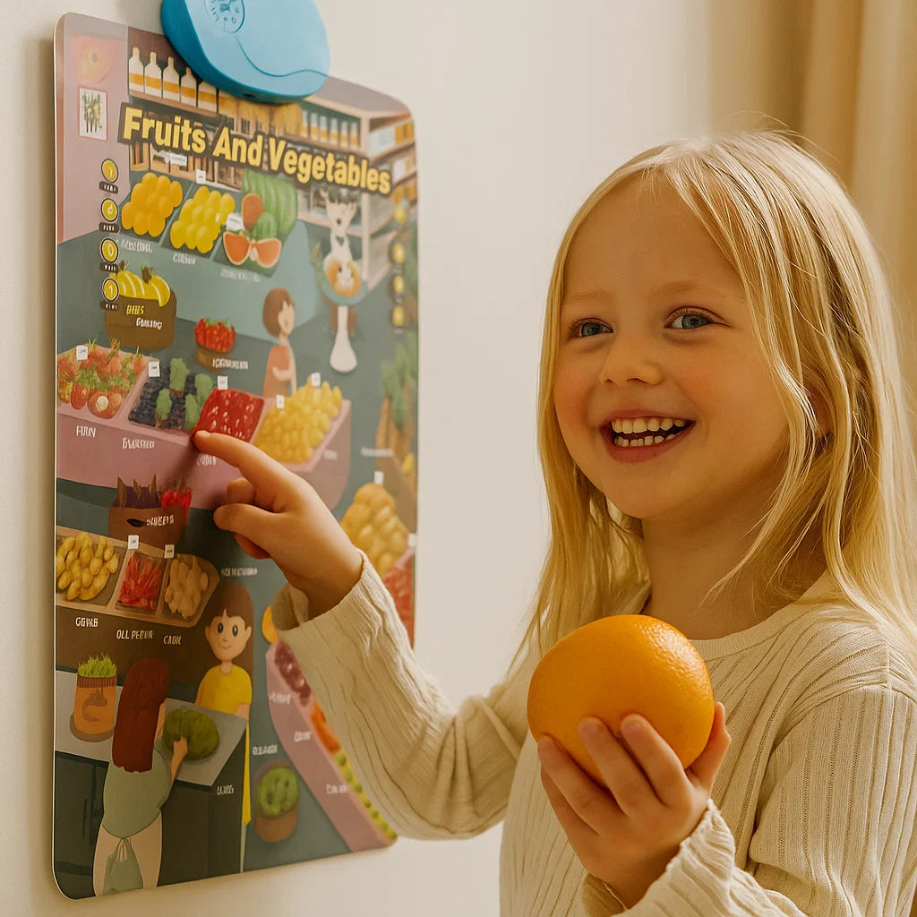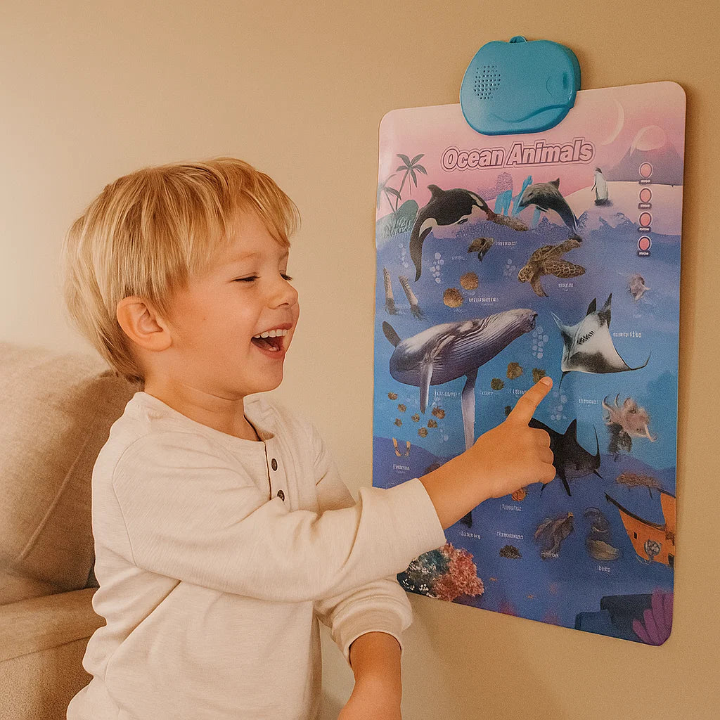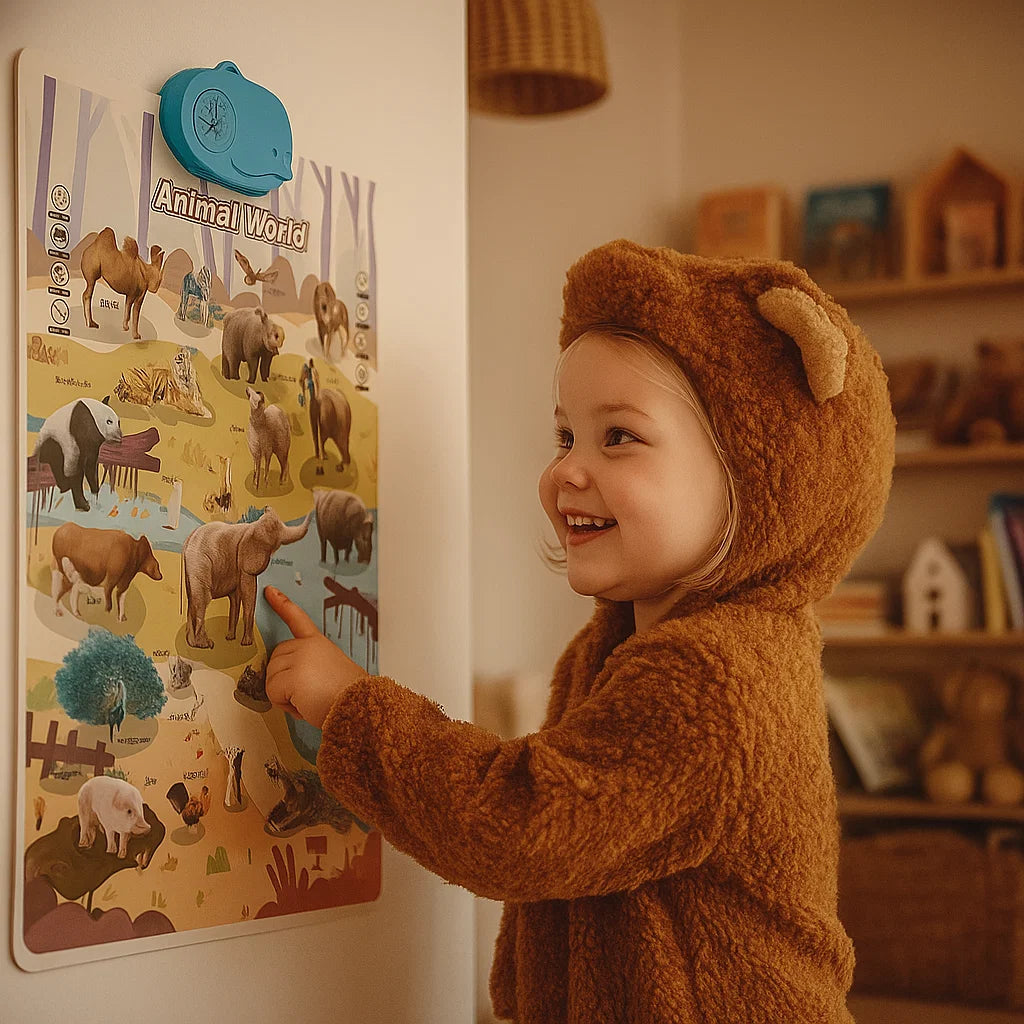 Gjør hverdagslek om til et spennende læringseventyr med den Interaktive Lydveggen for Barn. Designet for å fange nysgjerrige sinn, introduserer denne snakkende plakaten barna til en levende verden av dyr, gjenstander og natur gjennom lyd og bilder. Med bare et trykk kan barna høre navn og lyder av dyr og ord på engelsk – noe som gjør læring morsomt, engasjerende og helt skjermfritt.