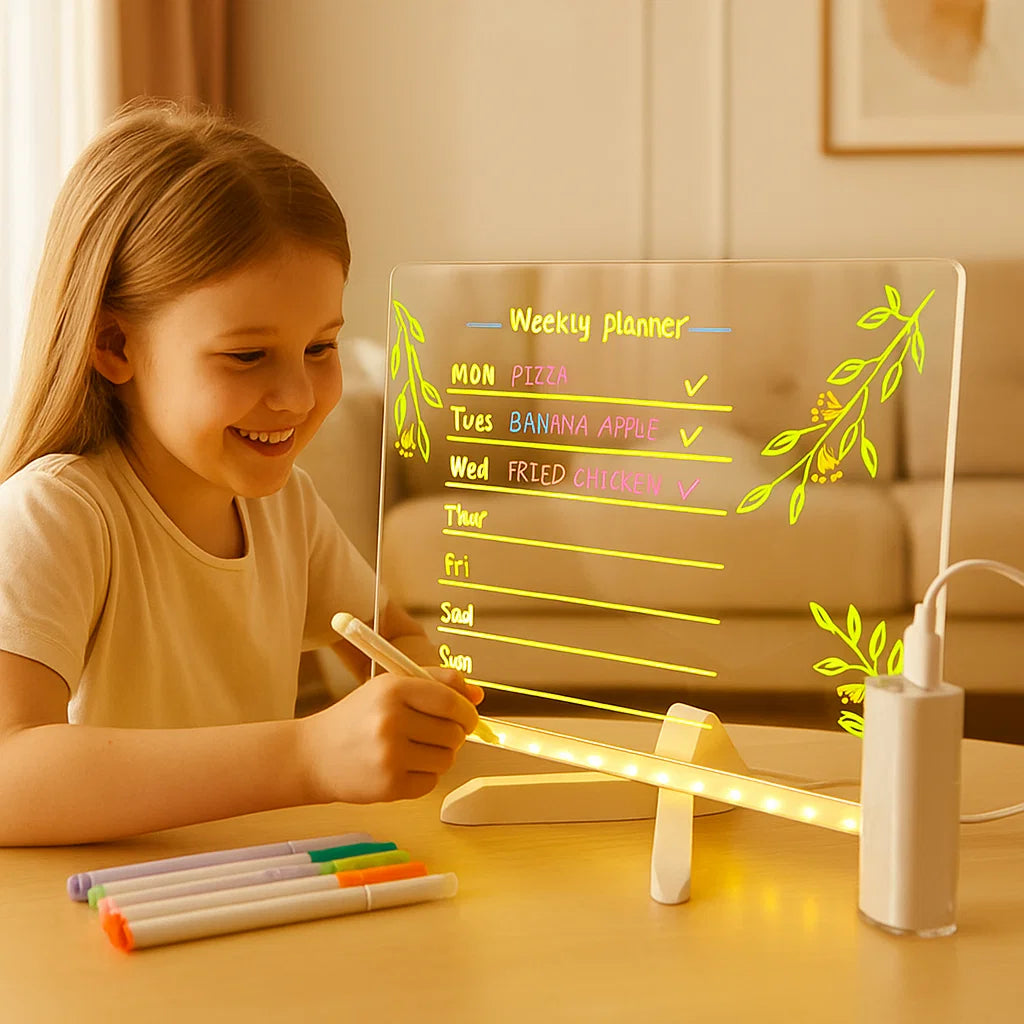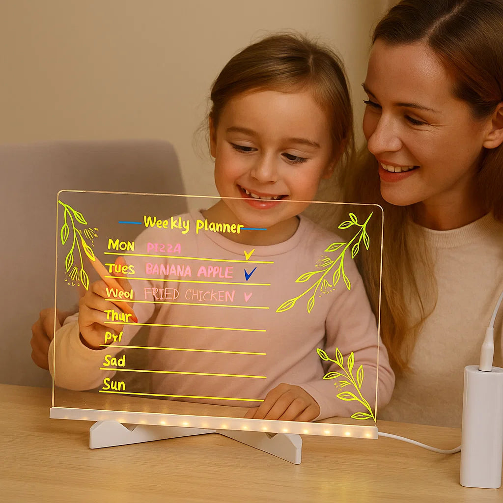 - ✍️ Oppmuntrer Til Kreativt Uttrykk: Den lyse LED-overflaten gir det perfekte rommet for barn til å tegne, skrive og fargelegge, noe som styrker kreativiteten og de kunstneriske ferdighetene.