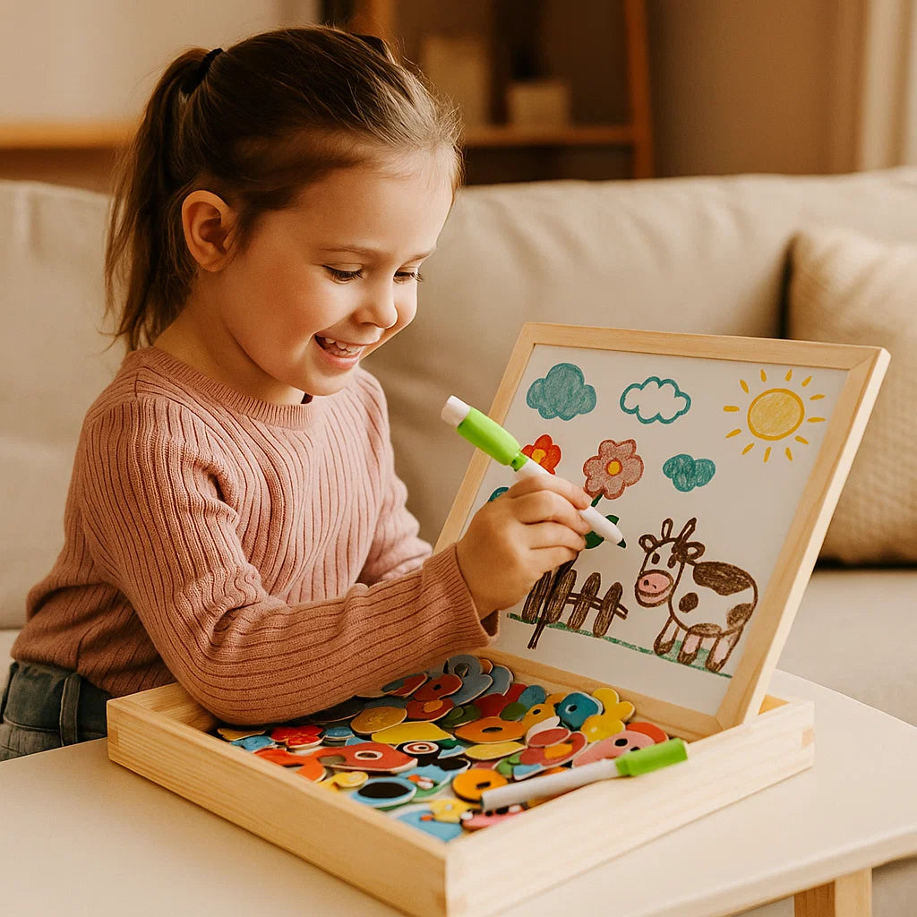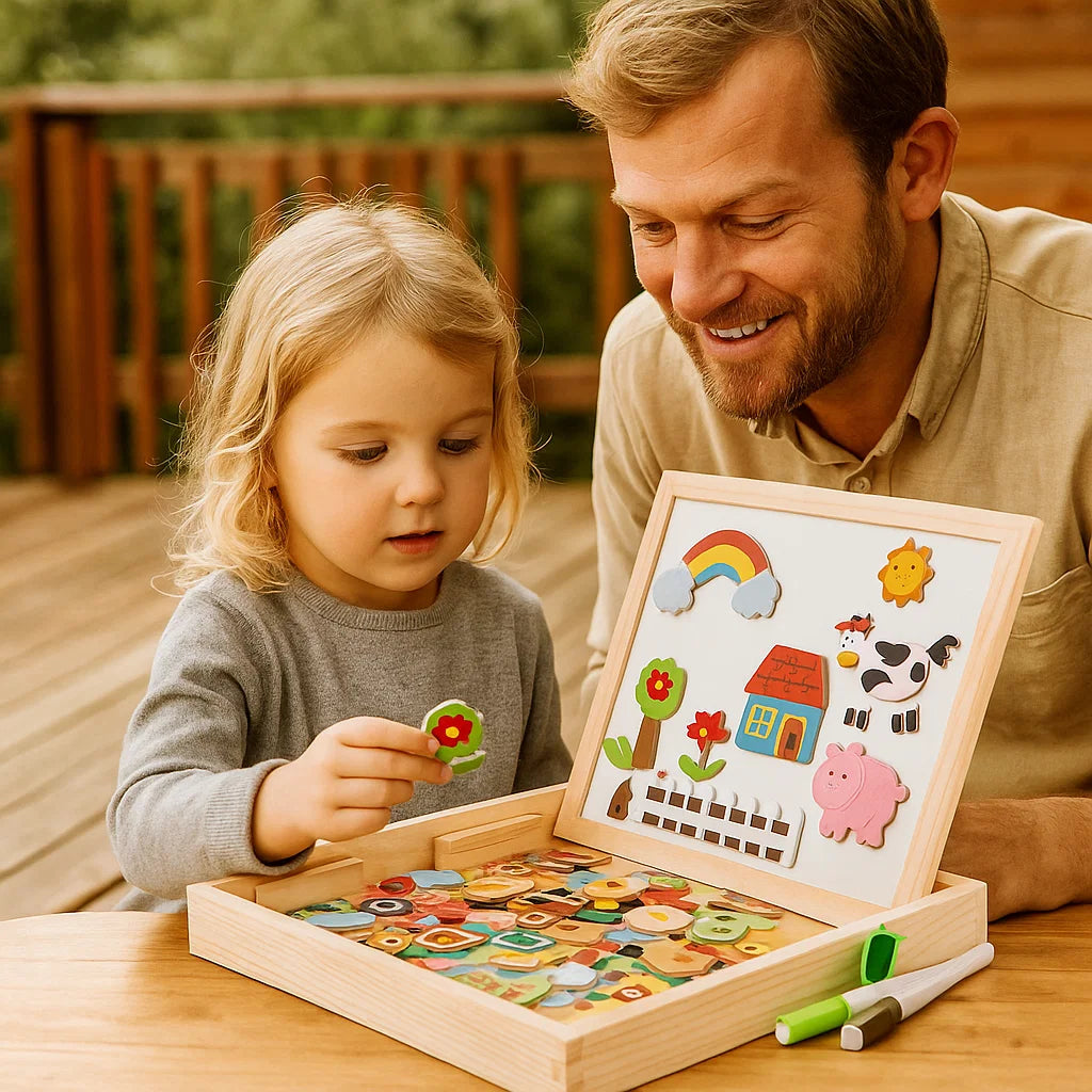 Si farvel til tankeløs skjermtid og hei til praktisk oppdagelse. Dette magnetiske puslespillbrettet gir barna en mulighet til å lære former, forbedre koordinasjonen og uttrykke fantasien sin uten å trenge en telefon eller et nettbrett. De holder seg fokuserte og underholdt samtidig som de utvikler kritisk tenkning og problemløsningsferdigheter – alt gjennom lek som føles morsom, ikke som lekser.