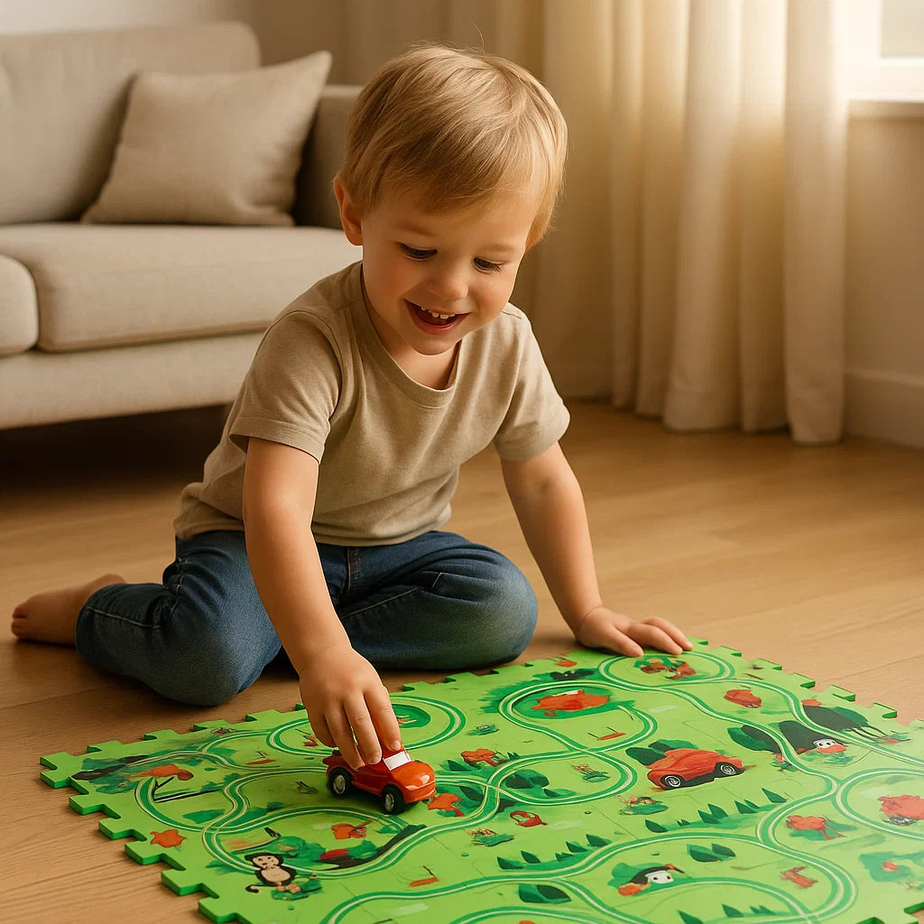 Med sammenkoblede veibiter og ubegrensede muligheter vokser denne matten sammen med barnets fantasi. Den er enkel å utvide, omorganisere og forandre for uendelige gjenspillingsmuligheter.