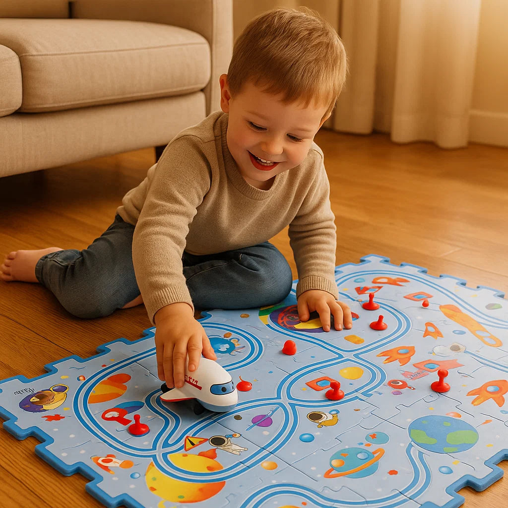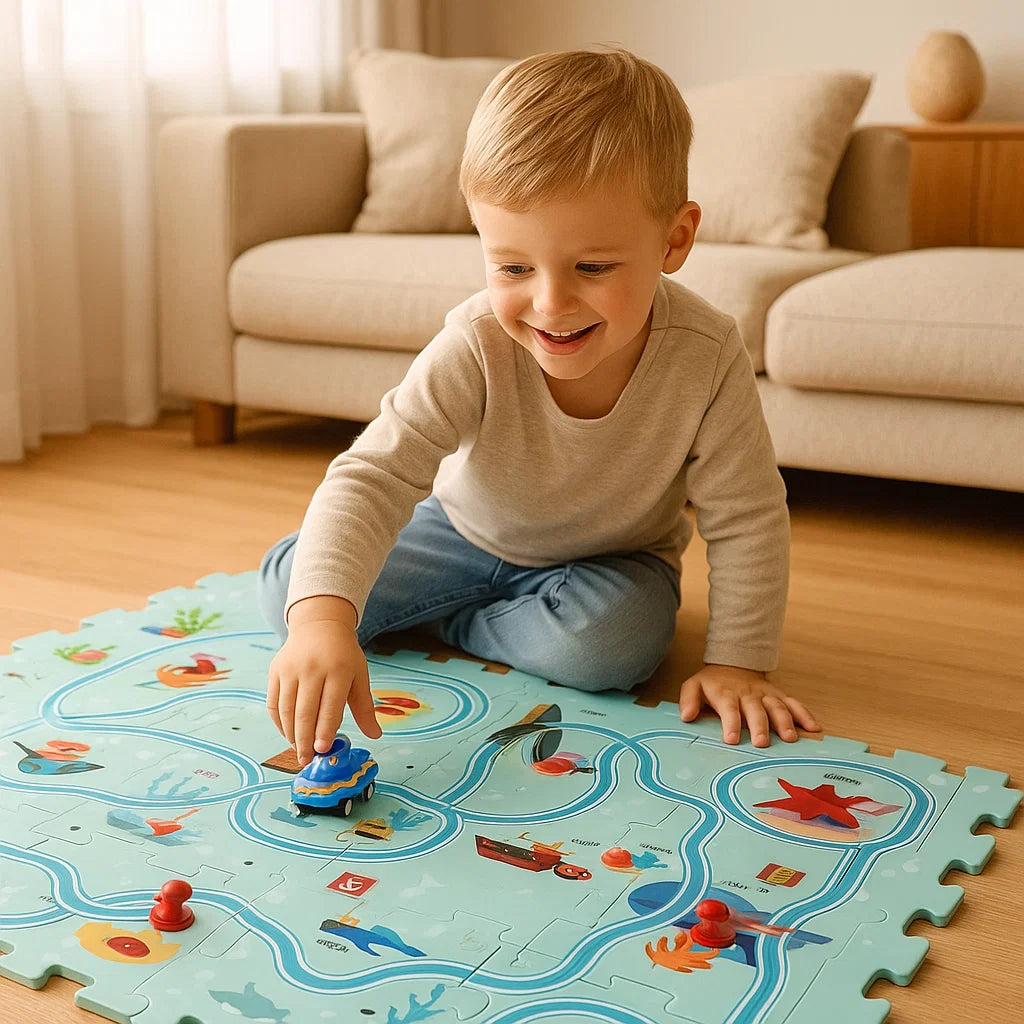 Puslespillspor lekematte for barn ⎜ Interaktivt gulvspill med sammenkoblingsbare veier for fantasifull racingmoro
