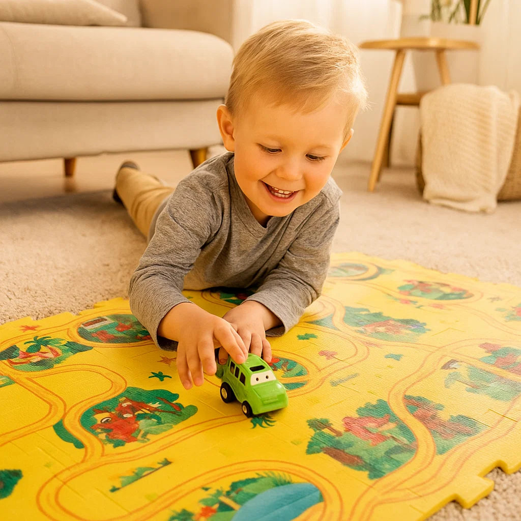 - 👣 Fremmer Fysisk Aktivitet: Krabbing, rekke ut, og kjøre biler rundt matten hjelper til med å bygge grovmotoriske ferdigheter og koordinasjon.