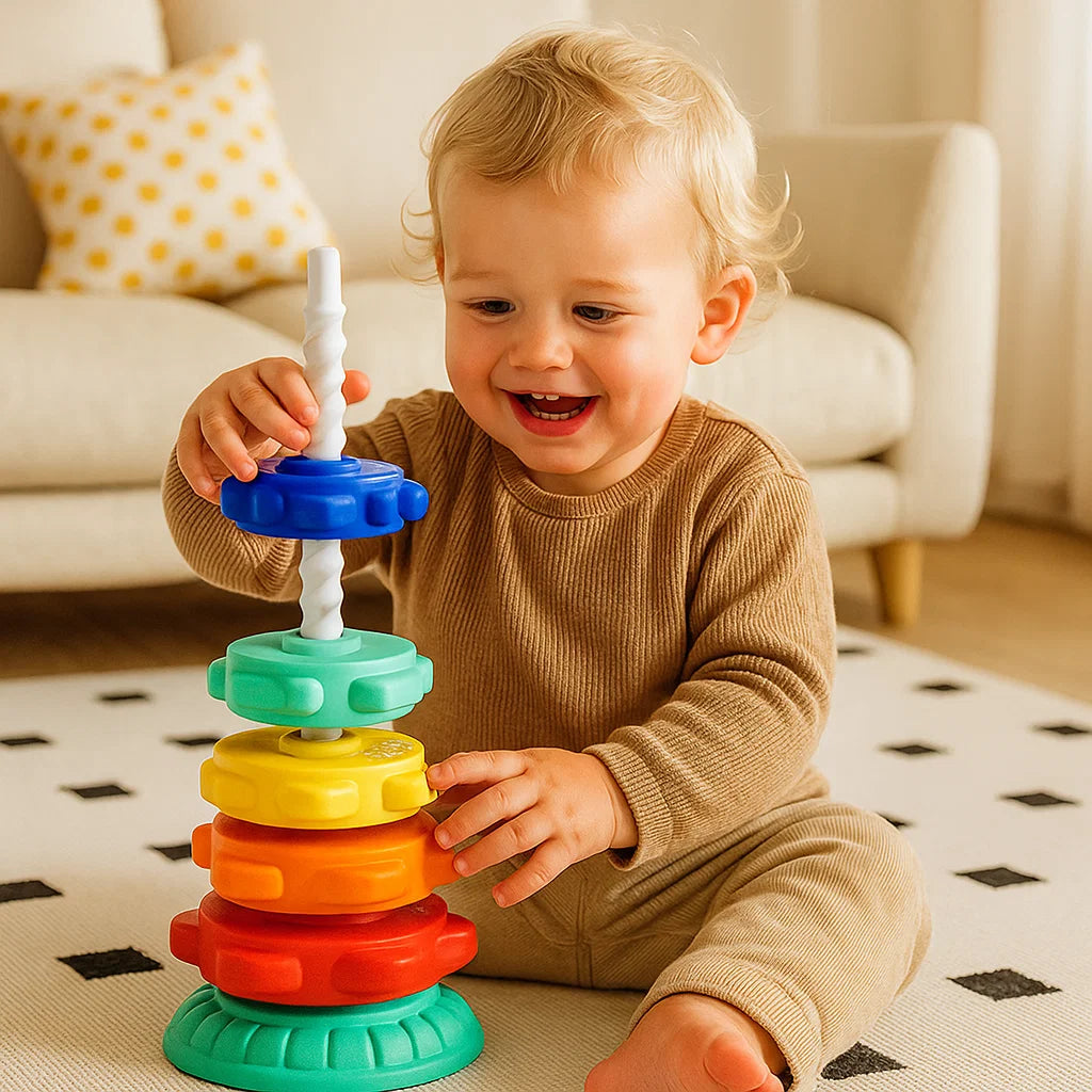 - 🧠 Utvikler logisk tenkning og motorikk – snurring og stabling trener hånd-øye-koordinasjon og problemløsningsevner.