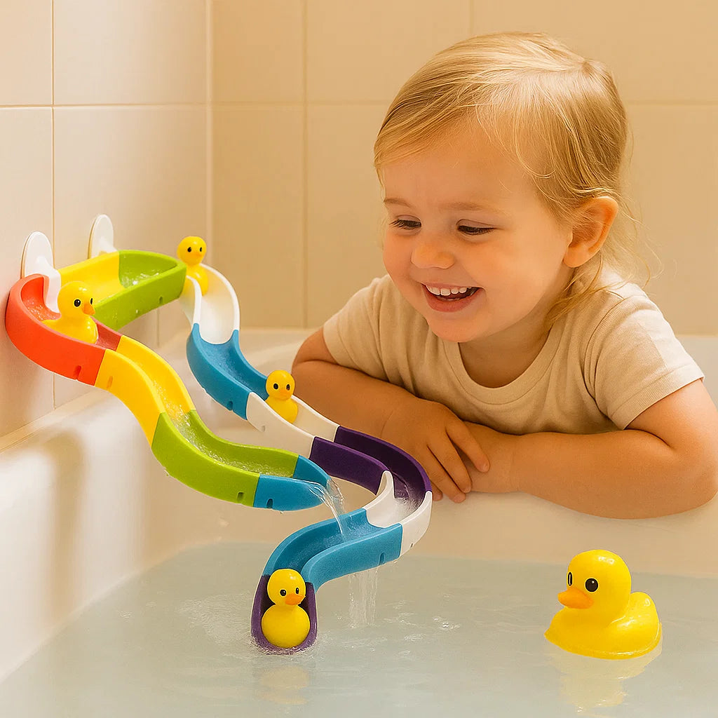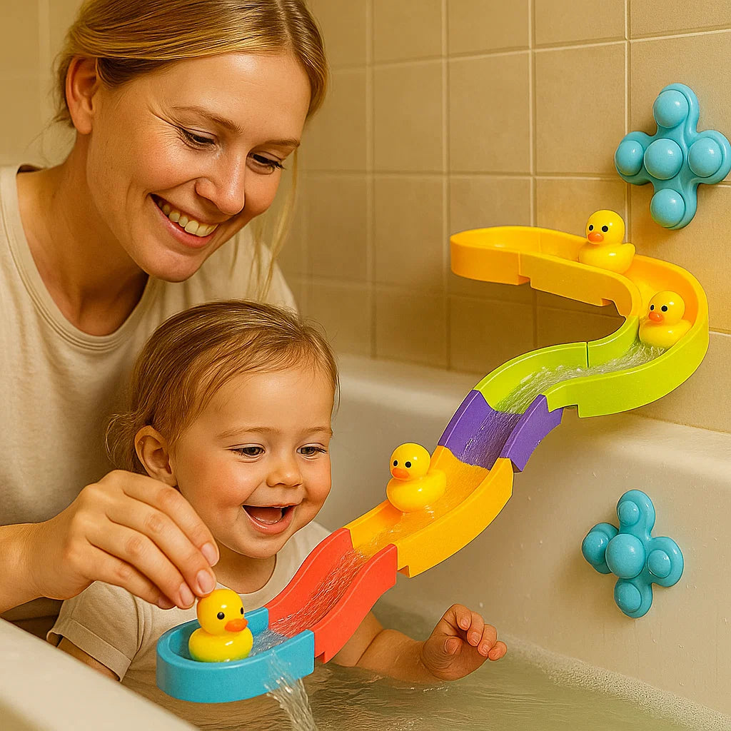 La barnet ditt utforske omgivelsene og nyte timevis med interaktiv lek. Vannsklie-Badeleken hjelper med å utvikle barnets kognitive ferdigheter samtidig som badetiden blir mindre av en plikt og mer av et eventyr. Denne engasjerende leken gir en morsom måte å introdusere småbarn til grunnleggende konsepter som bevegelse og retning. For hvert rull med endene nedover sklien får barnet en dypere forståelse av årsak og virkning – alt mens de har det gøy i badekaret.